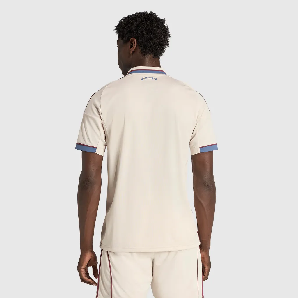 A base Halo Ivory (bege suave) reflete os tons do antigo documento histórico, criando uma estética minimalista e sofisticada. Ao mesmo tempo, detalhes em azul e vermelho escuro remetem diretamente às cores da cidade de Amsterdã.O escudo moderno do Ajax se destaca no peito, enquanto a gola apresenta um tríptico simbólico: 1275, 2025 e as icônicas três cruzes de Santo André — elemento que se repete nos uniformes da temporada.Além disso, a parte interna da gola traz uma versão contemporânea do brasão histórico da cidade. Um detalhe em flâmula tecida na parte superior das costas reforça a narrativa cultural. Dessa forma, o uniforme se torna um verdadeiro arquivo vestível, equilibrando tradição e minimalismo moderno.