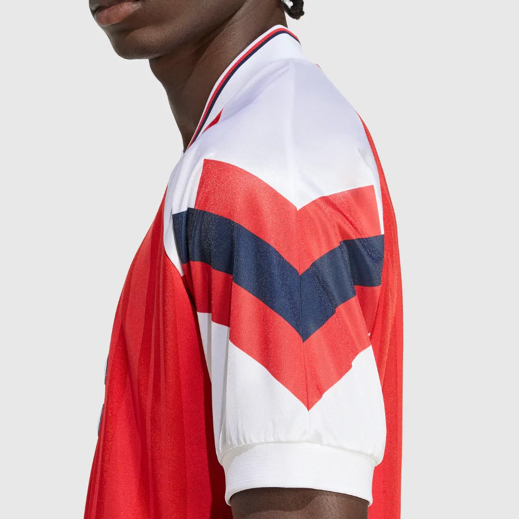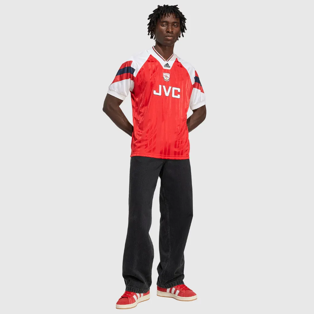 O design mantém a base vermelha clássica do Arsenal, elemento central da identidade do clube. Ao mesmo tempo, detalhes sutis em azul-marinho nas mangas adicionam equilíbrio visual. O escudo histórico Victoria Concordia Crescit ocupa lugar de destaque no peito, reforçando a filosofia do clube. Dessa forma, a camisa preserva fielmente o visual utilizado entre 1992 e 1994.