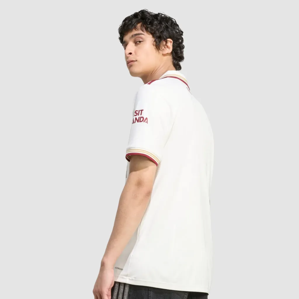 A base em branco-creme cria uma atmosfera elegante e atemporal. Essa escolha remete aos uniformes clássicos do Arsenal e transmite uma sensação de requinte minimalista. Ao mesmo tempo, detalhes em bordô profundo aparecem nas Três Listras e na gola, adicionando contraste nobre e reforçando o DNA tradicional do norte de Londres.