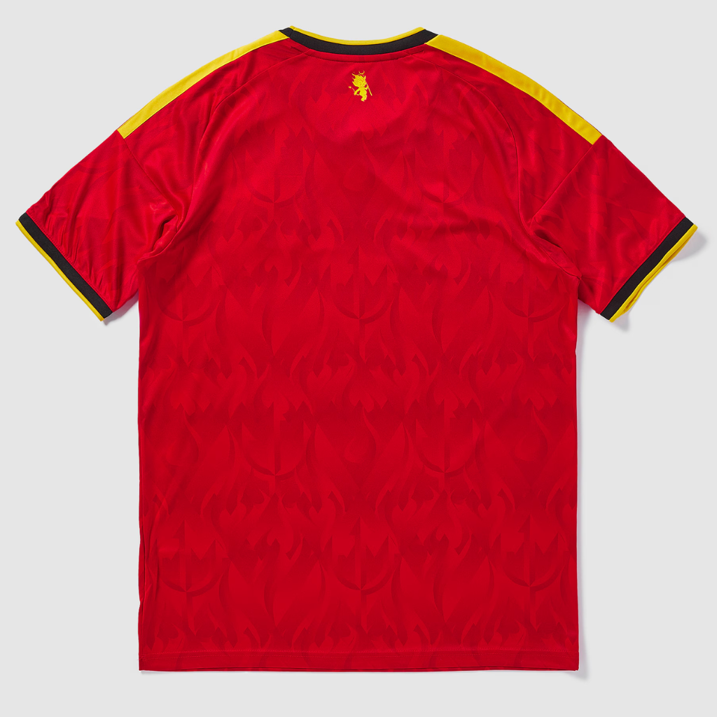 A base vermelha ganha profundidade com padrões tonais de tridentes e chamas. Além disso, a gola redonda e os punhos com estilo raglan trazem preto e amarelo, refletindo as cores da bandeira belga. As três listras largas em amarelo surgem nos ombros, seguindo o novo padrão da adidas para 2026. O escudo da RBFA aparece atualizado no peito esquerdo, enquanto o logo adidas, também em amarelo, ocupa o lado direito. Dentro da gola, há uma referência divertida ao Manneken Pis, símbolo cultural de Bruxelas, retratado com chamas, tridente e elementos demonizados. O tecido interlock leve favorece circulação de ar, enquanto a tecnologia Climacool mantém respirabilidade. Além disso, as costuras reforçadas garantem durabilidade e caimento firme.