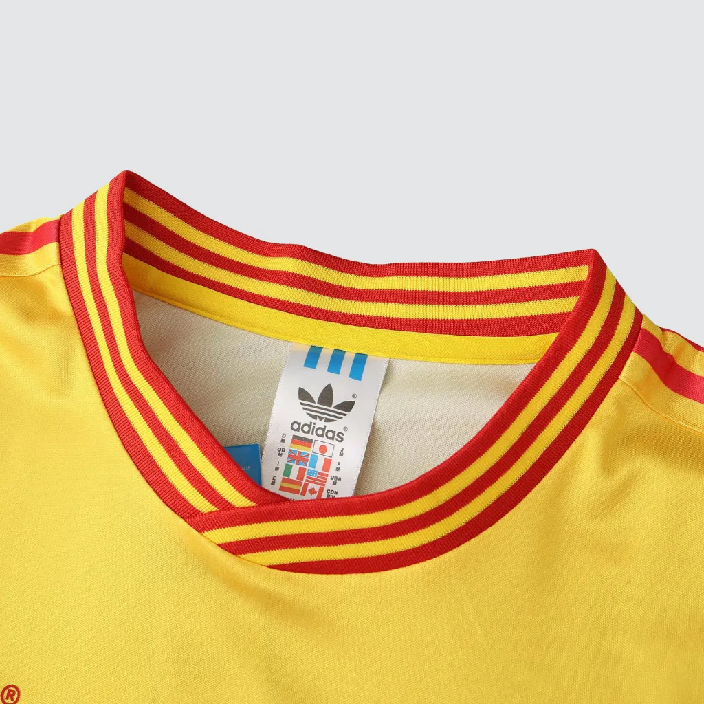Inspirada no uniforme utilizado na Copa do Mundo da Itália em 1990, a camisa apresenta um design color block típico dos anos 90, combinando dourado, vermelho e azul de forma marcante. Esse visual icônico imediatamente remete a uma geração inesquecível do futebol colombiano. Nomes como Carlos Valderrama, René Higuita, Freddy Rincón e Andrés Escobar ajudaram a eternizar essa camisa no imaginário dos torcedores. O escudo da Federação Colombiana de Futebol aparece bordado sobre o peito, reforçando o orgulho nacional. Além disso, o logo adidas Originals e as Três Listras mantêm o visual fiel ao período, preservando a essência retrô que torna essa peça tão especial.