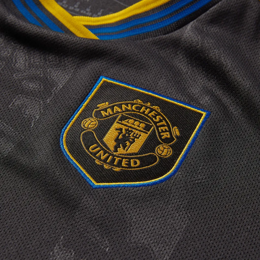 O escudo do Manchester United no peito, em versão refinada e limpa, posiciona a identidade do clube no centro da narrativa. Assim, tradição e modernidade convivem no mesmo tecido.