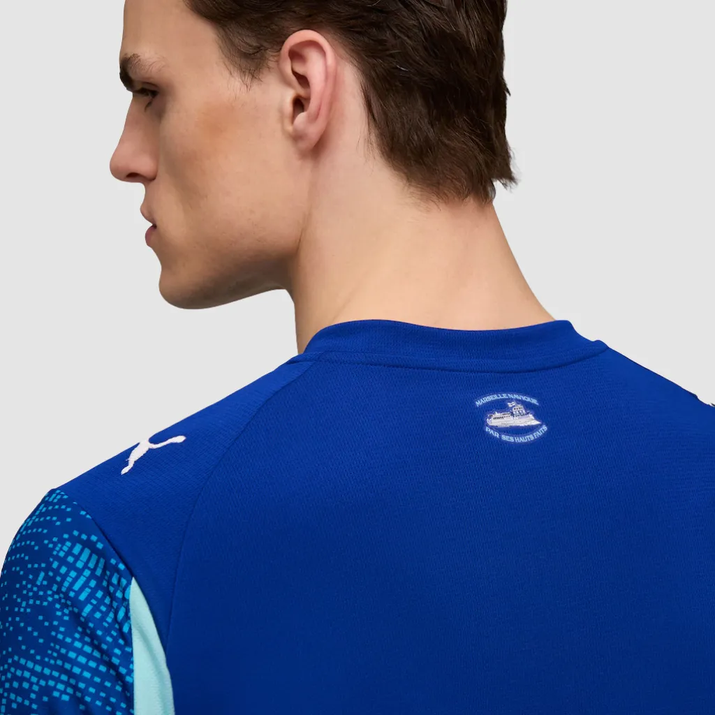 O escudo do Olympique de Marseille no peito reforça o orgulho local, enquanto o logo da PUMA completa o visual com equilíbrio e modernidade. Dessa forma, tradição e contemporaneidade coexistem na mesma peça.