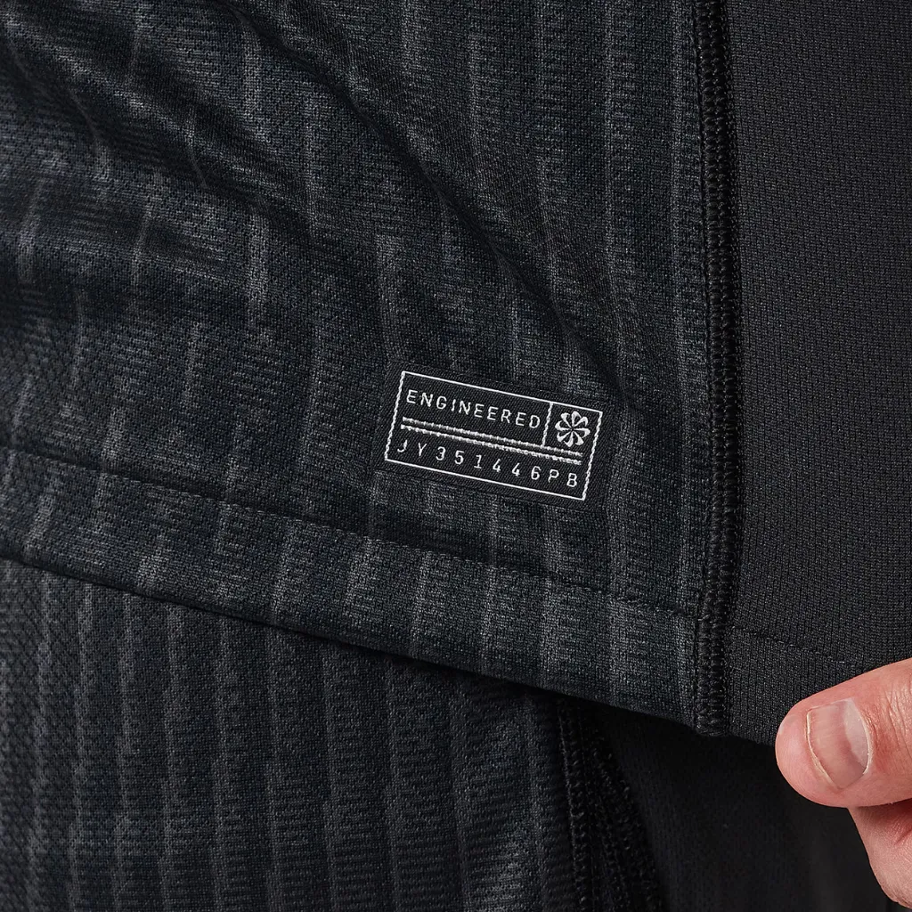 Inspirada na tradição dos ateliês de moda de Paris, a camisa apresenta uma base em tom escuro refinado, oficialmente descrito como Off Noir, combinando nuances de cinza profundo com leve fundo marrom arroxeado. Dessa forma, o visual se mantém sóbrio, elegante e altamente contemporâneo. Os detalhes em rosa pérola e prata adicionam contraste delicado, reforçando o caráter fashion da peça. Um dos grandes destaques do uniforme está no logo Jordan em rosa claro, substituindo o tradicional branco e elevando o conceito premium do design. Além disso, a camisa apresenta uma linha vertical discreta no centro, interrompida pelo patrocinador, criando uma estética limpa e alinhada ao minimalismo moderno. A versão réplica inclui uma estampa visual do Dri-FIT ADV aplicada sobre o tecido Dri-FIT tradicional, reforçando o aspecto técnico sem comprometer o visual.CONFORTO, TECNOLOGIA E USO URBANO
