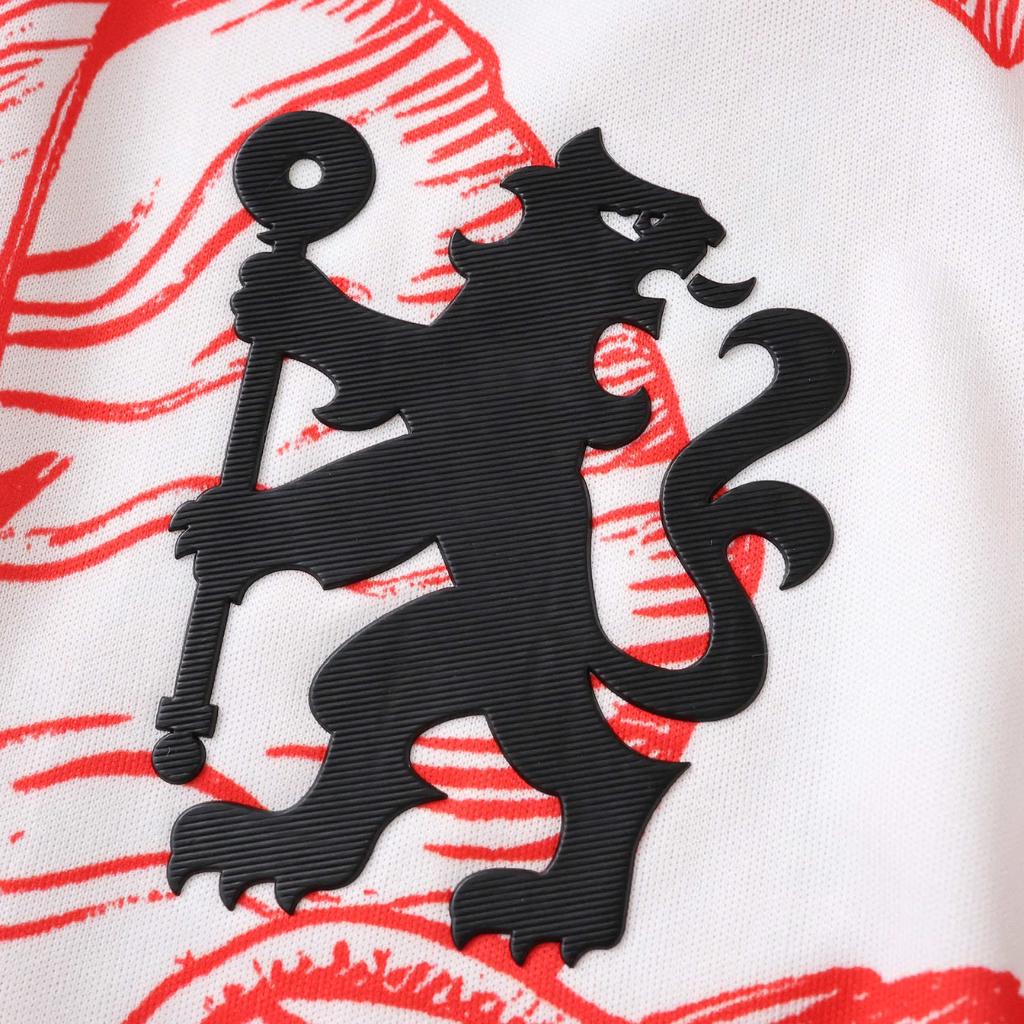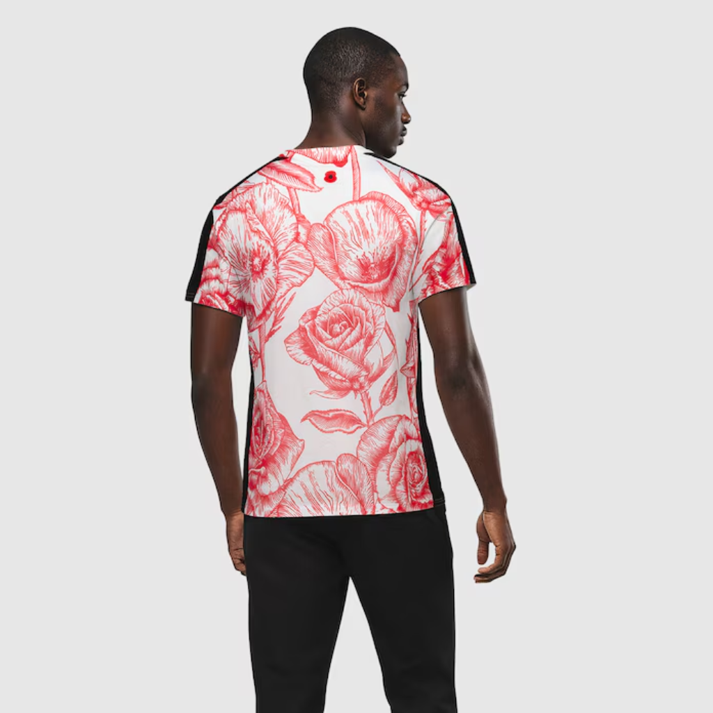 A peça apresenta base branca com estampas de papoulas vermelhas desenhadas à mão, cobrindo corpo e mangas de forma contínua. Além disso, o escudo do Chelsea aparece no peito, enquanto o emblema oficial da Campanha da Papoula surge na parte de trás da gola como símbolo de respeito. Uma etiqueta especial da Royal British Legion está posicionada acima da barra, reforçando o propósito do design. A gola redonda traz acabamento limpo e confortável. O tecido 100% poliéster oferece leveza e respirabilidade, ideal para aquecimentos, treinos curtos e uso casual. A construção em manga curta permite mobilidade ampla, mantendo estilo marcante e homenagem visual.