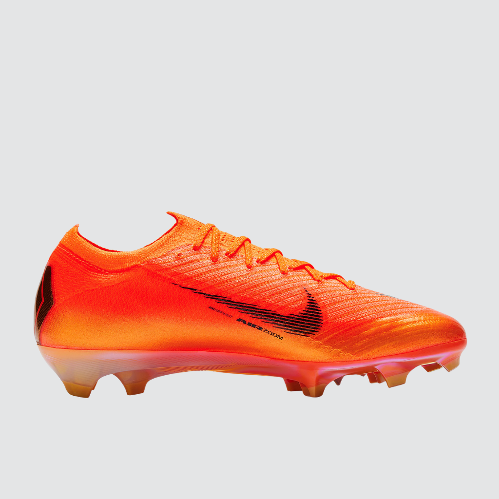 | Caractersticas | • Edição especial “Déjà Vu” inspirada na história da cor laranja da linha Mercurial • Cabedal ultrafino de três camadas: Flyknit (conforto), Atomknit (suporte) e Gripknit (controle) • Travas Chevron e Blade evoluídas para mudanças rápidas de direção • Placa Pebax leve com zonas de flexão otimizadas para estabilidade e impulso • Unidade Zoom Air em toda a extensão para retorno de energia em sprints • Trava Wave no antepé com altura equivalente às travas centrais tradicionais da Nike • Ajuste aerodinâmico para condução precisa em alta velocidade • Palmilha acolchoada para maior conforto em jogos longos • Ideal para superfícies naturais firmes (FG) • Usada por atletas como Cristiano Ronaldo, Kylian Mbappé e Vinicius Jr. |