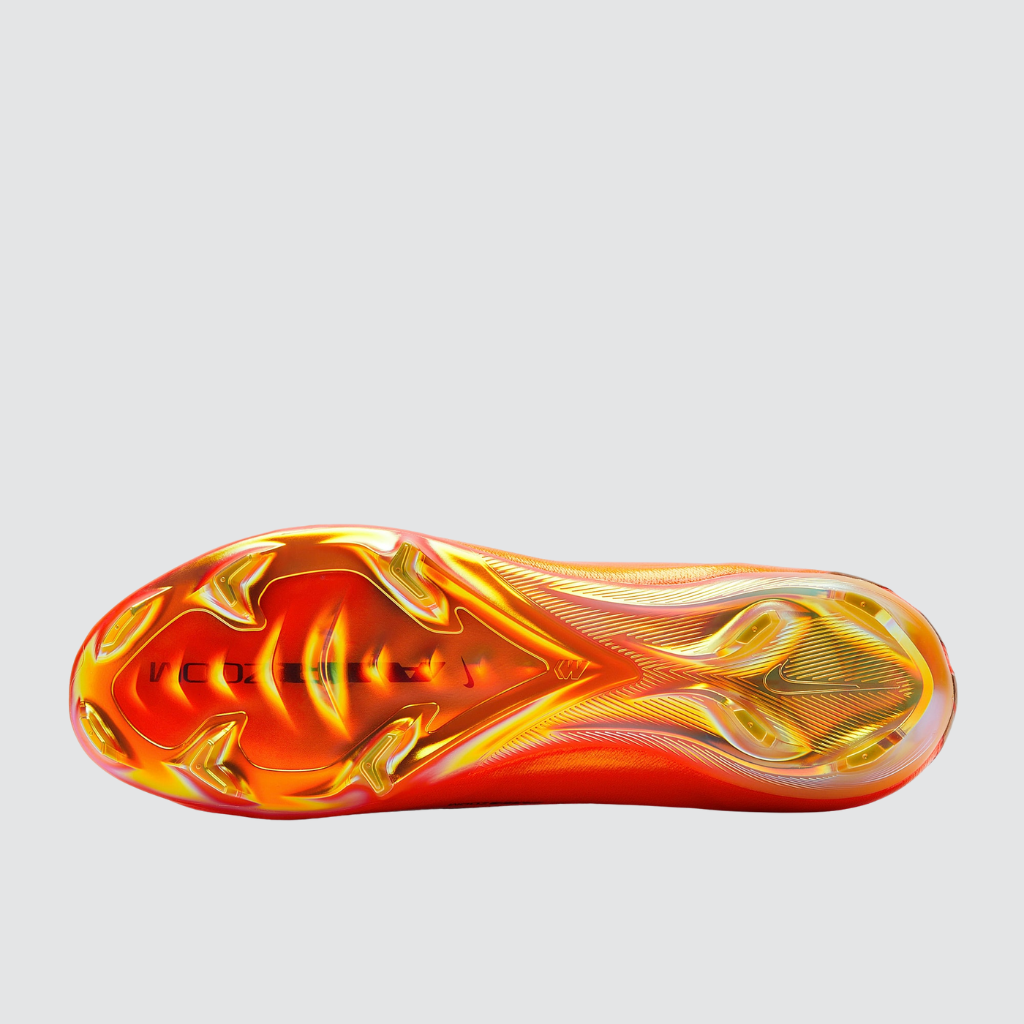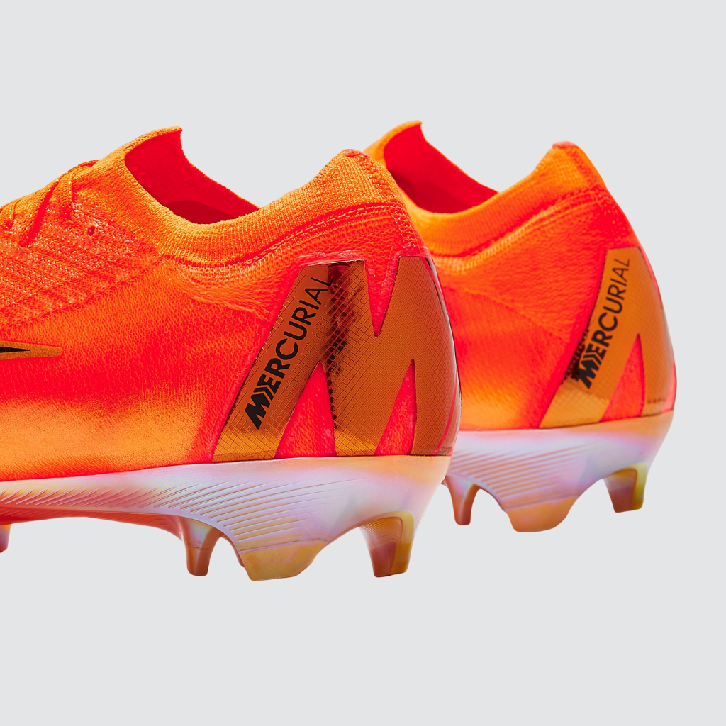 O cabedal apresenta um laranja vibrante que presta homenagem às Mercurials icônicas do passado. Detalhes dourados, incluindo o chevron inspirado na Mercurial 360 e o degradê da CR7 “Forged for Greatness”, reforçam o DNA histórico. O cabedal usa três camadas: Flyknit para elasticidade, Atomknit para suporte e Gripknit para controle em qualquer clima. O solado FG traz travas Chevron e Blade com tração multidirecional, além da onda de tração “Wave” no antepé, que ativa a unidade Zoom Air para maior retorno de energia. Ideal para campos naturais firmes.