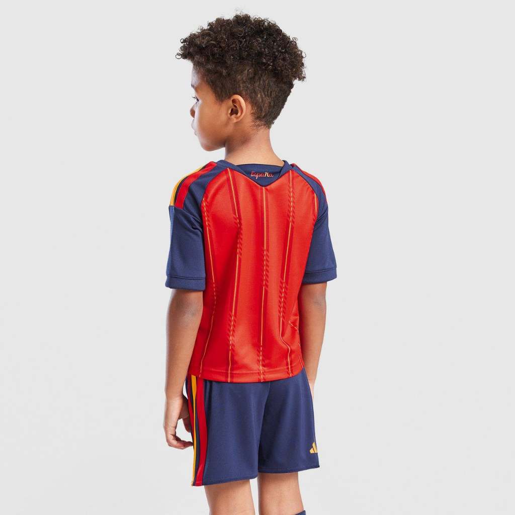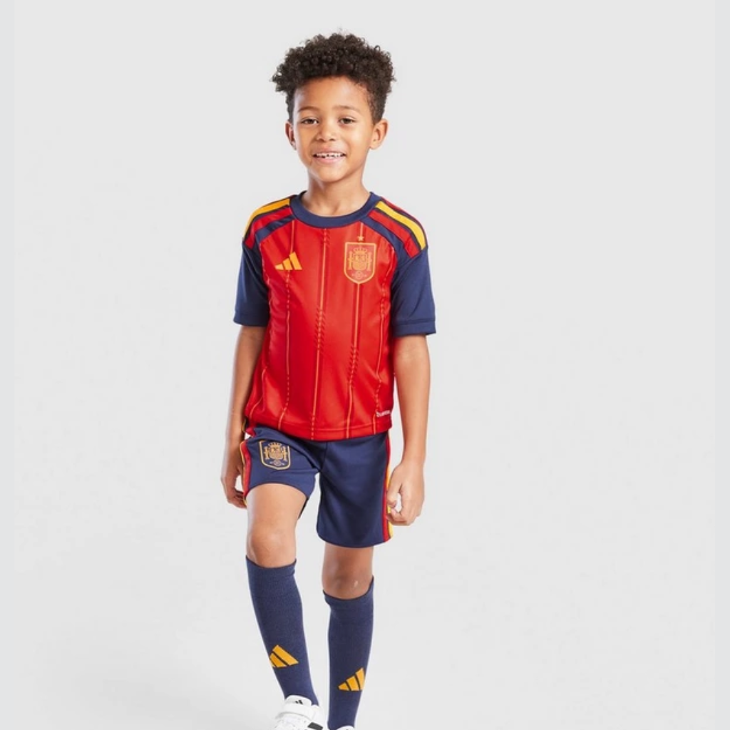 O kit infantil Espanha 2026 traz camisa vermelha com listras amarelas inspiradas na bandeira e calção azul-marinho combinando. Com tecnologia Climacool, tecido leve e ajuste confortável, oferece mobilidade, frescor e identidade para os pequenos torcedores.