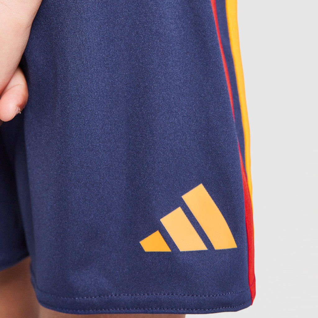 A camisa traz base vermelha intensa com finas listras verticais amarelas que remetem diretamente à bandeira espanhola. Além disso, a gola redonda e as mangas em azul-marinho criam contraste equilibrado e moderno. As três listras da adidas nos ombros alternam vermelho e amarelo, reforçando o DNA esportivo da marca. O escudo da Espanha aparece no lado esquerdo do peito com fundo vermelho e linhas amarelas, enquanto o logo da adidas segue a mesma paleta. Da mesma forma, a inscrição “España” na parte interna da gola fortalece o sentimento de identidade nacional. O calção azul-marinho completa o conjunto com detalhes em vermelho e amarelo, mantendo unidade visual e estilo marcante.