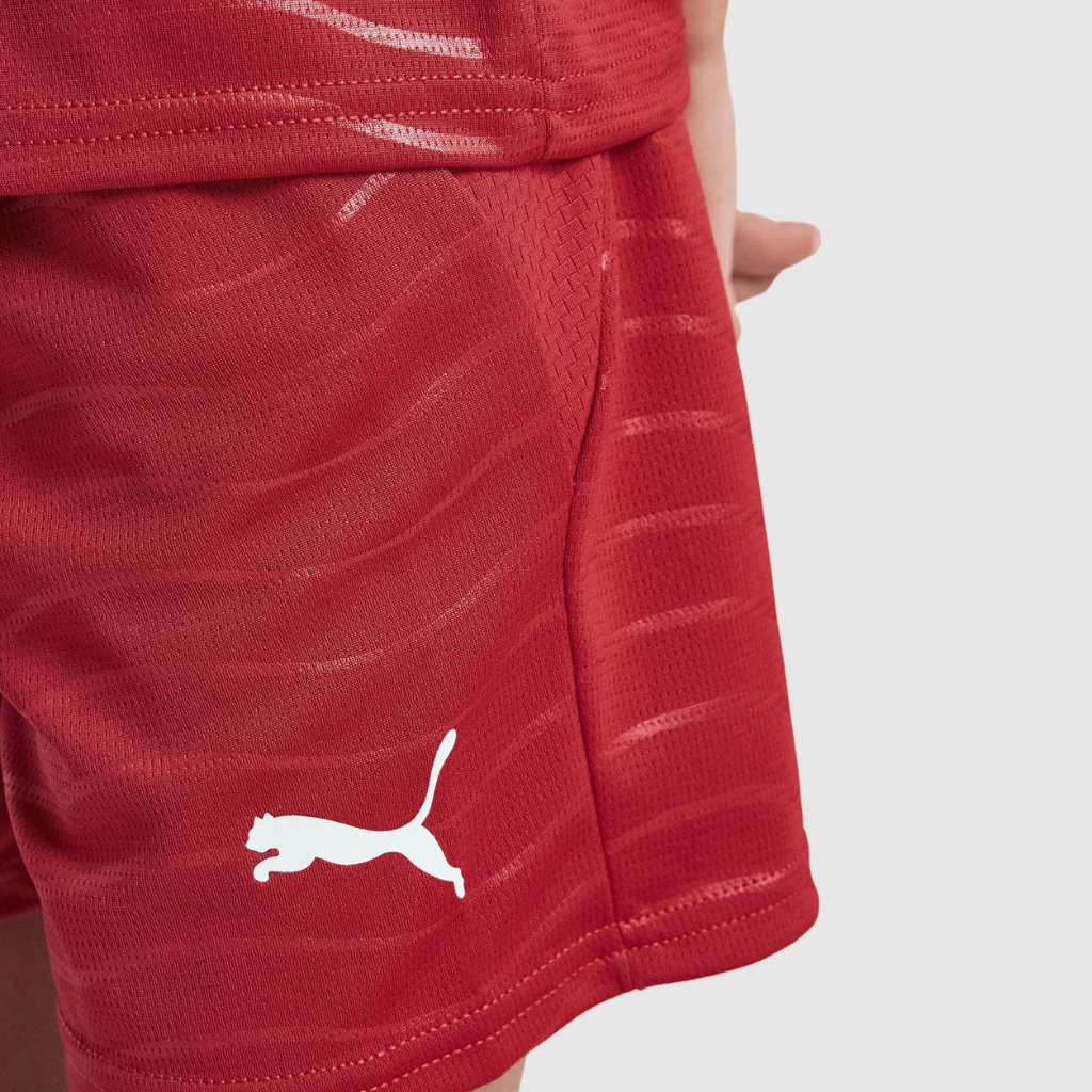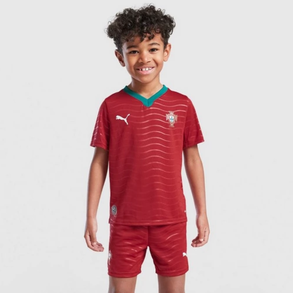 A camisa do kit apresenta base vermelha com gola V em formato especial, destacada pelo verde centralizado, repetido também nos punhos. Além disso, o corpo e as mangas recebem grafismos ondulados em tecido levemente brilhante, referência direta ao Oceano Atlântico e às grandes navegações portuguesas. O escudo da FPF aparece no peito esquerdo em sua versão atual, enquanto o felino da PUMA surge em branco nas mangas e no lado direito do peito. O conjunto é completado com calção vermelho, mantendo o padrão histórico utilizado em campanhas marcantes da seleção, como em 2016. Dentro da gola, a rosa dos ventos reforça o simbolismo marítimo e cultural. Cada detalhe foi pensado para transmitir identidade e orgulho nacional em versão mini.