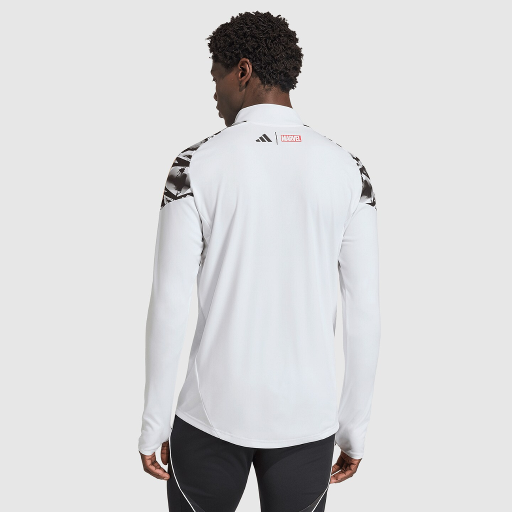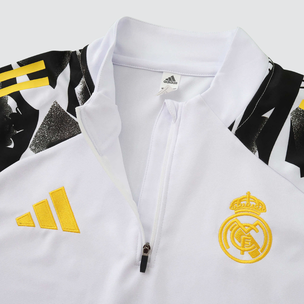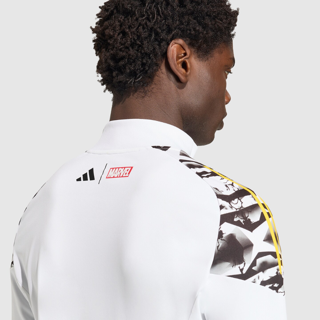A camisa de treino apresenta base branca com estampas de raios em dourado vibrante, inspiradas no deus nórdico Thor. Além disso, o design faz referência direta ao apelido histórico do clube, “Los Vikingos”, associado à força implacável e ao espírito conquistador do Real Madrid. O escudo do clube aparece aplicado sobre o coração, enquanto os logotipos da adidas e da Marvel completam o visual com identidade premium. A gola alta canelada com zíper até o peito oferece proteção contra o vento, enquanto as mangas longas reforçam o uso em dias frios. Os detalhes gráficos se integram ao design técnico, criando um conjunto marcante tanto dentro quanto fora de campo.