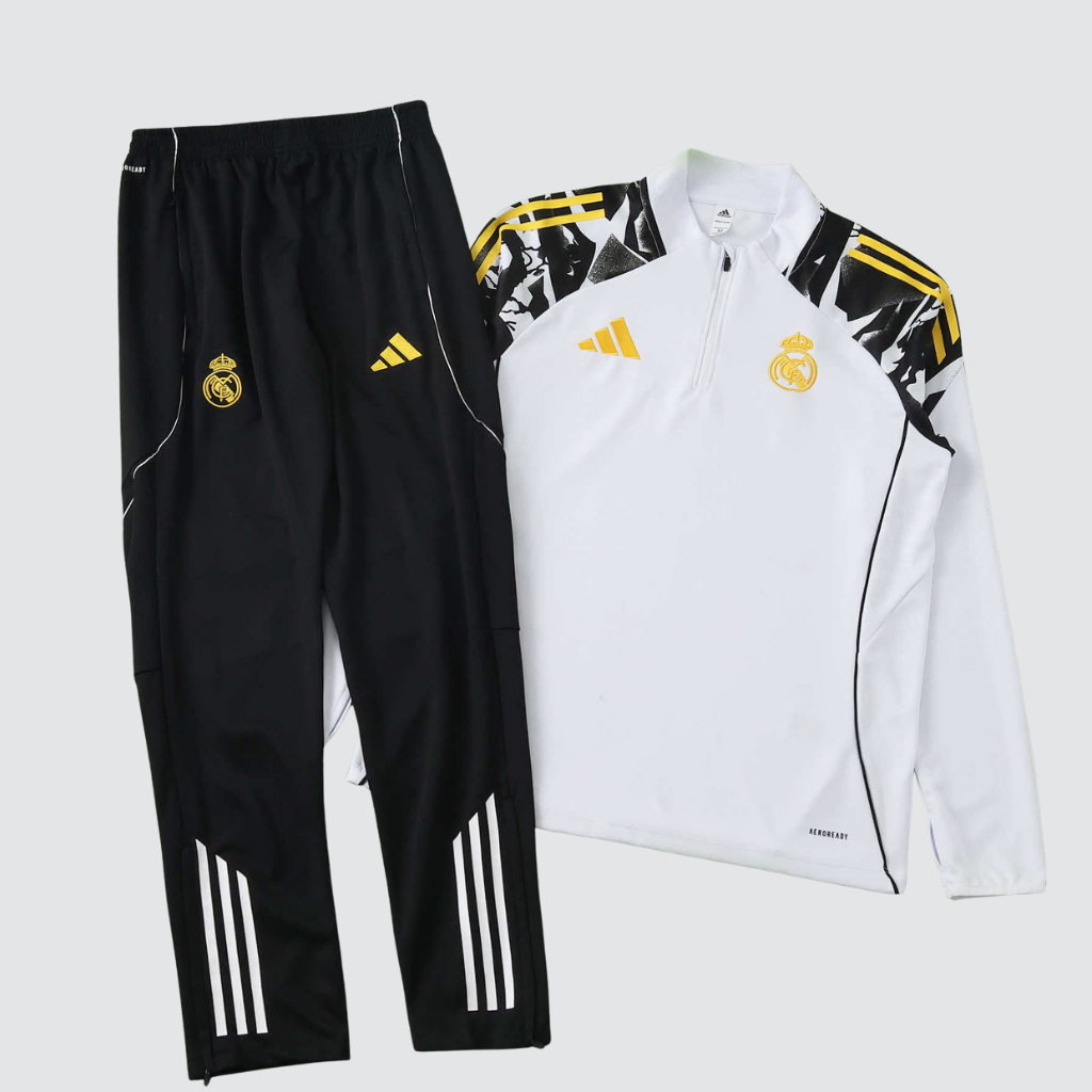 O conjunto de treino Real Madrid x Marvel 2026 combina design inspirado em Thor com tecnologia AEROREADY. Com base branca, detalhes dourados, gola alta e corte justo, entrega conforto, mobilidade e identidade forte para treinos intensos.