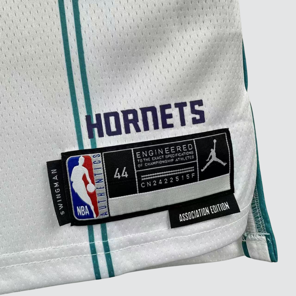 O uniforme apresenta fundo branco, combinado com detalhes em verde-água e azul, cores marcantes da identidade do Charlotte Hornets. O nome Charlotte aparece em destaque no peito, acompanhado da numeração limpa e bem definida.